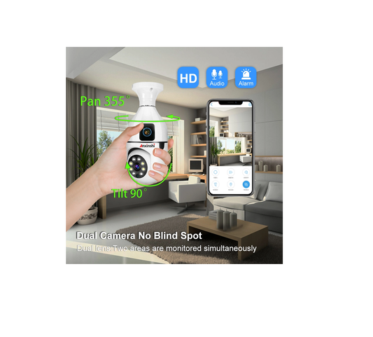 Dual Lens Dual Screen Bulb WiFi Wireless 2MP+2MP= 4MP HD 1080P Live View PTZ Control, Two Way Talk,Day & Night Color Vision, AI Human Detection Indoor Camera